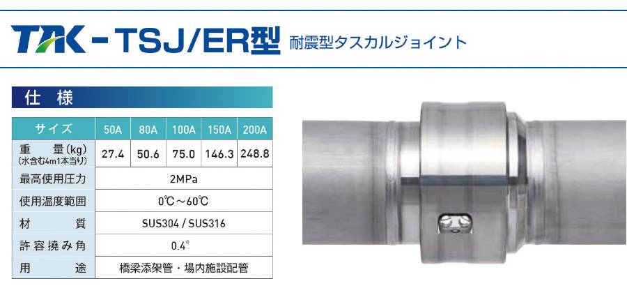 タスカルジョイントは元々、建築設備での給水配管、連結送水管で多数採用されてきた継手技術でしたが、これをベースに主に橋梁添架管向けに耐震性能を強化し、開発したのが「ER型」となります。