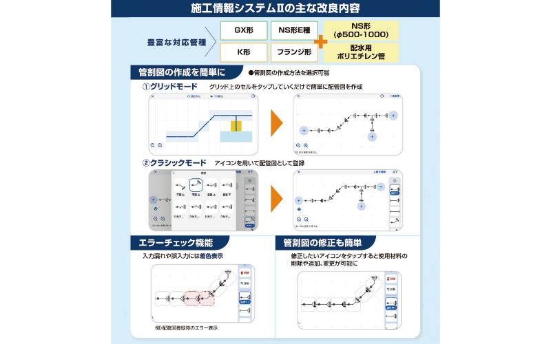 施工情報システムは、管工事の際に必要な施工管理をスマートフォンで行いながら、管理情報などをもとに、継手チェックシート、工事日報、管割図といった施工管理書類を自動生成するものです。昨年4月にサービスを開始した施工情報システムⅡは、従来のシステムと比べ、操作性の大幅な向上と対応管種の拡大を実現しました。従来のシステムをご使用いただいたお客様から様々なご意見を頂戴しそれらを可能な限り反映させたこともあり、今のところ「非常に使いやすくなった」と評価していただいています。管種についてはGX形、NS形E種、K形、フランジ形のダクタイル鉄管に加え、φ500~1000のNS形と配水用ポリエチレン管にも対応できるようになりました。