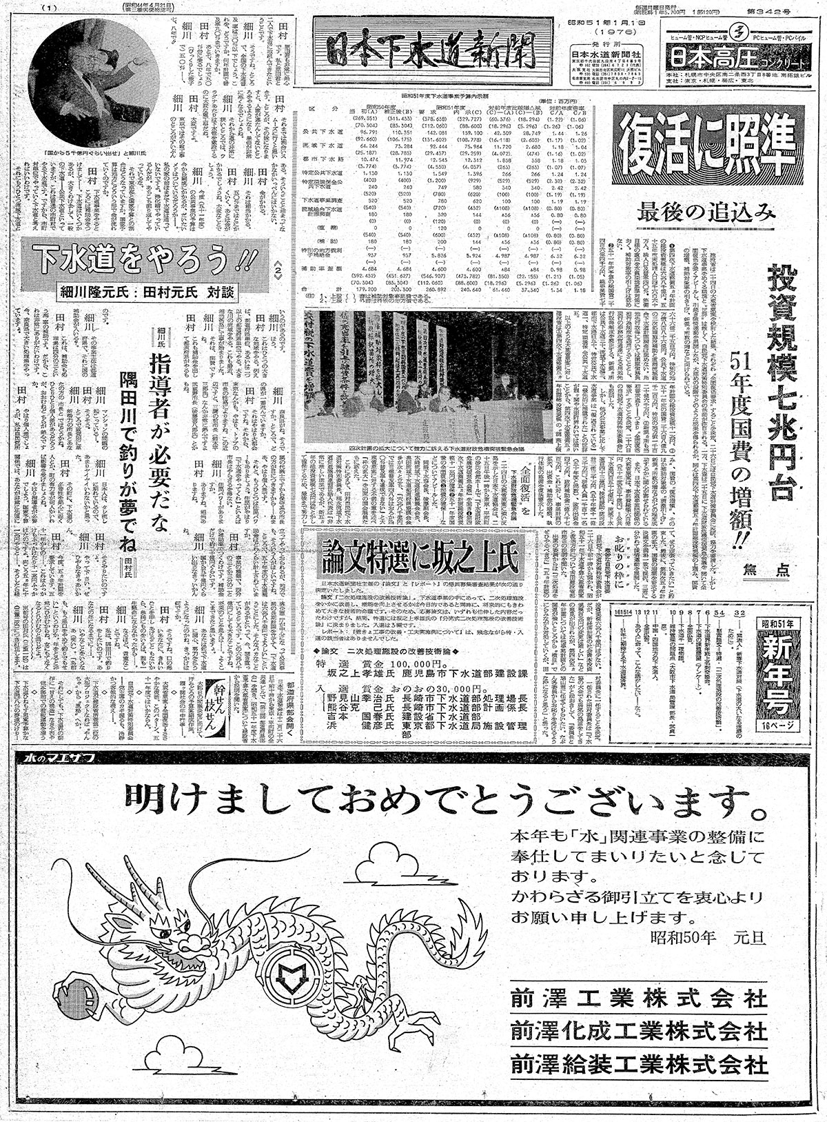 下水道促進全国大会、下水道促進婦人会議でのあいさつはもちろん、政府の予算案編成時期に精力的な働きをしたことは、多くの下水道関係者の知るところでありましたが、日本下水道新聞では、当時のテレビなどで「政治のご意見番」として評判高かった細川隆元氏との対談を昭和51年1月1日号から数回にわたって連載しました。