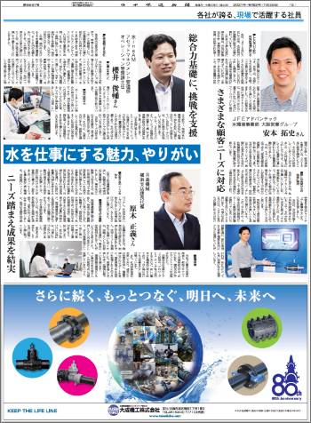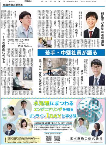 「日本水道新聞/日本下水道新聞」では、これから就職活動や業界研究に取り組まれている学生の皆さま向けに、「水インフラにかかわる仕事」に焦点を当てた就職活動応援特集を展開しております。2021年7月に発行した本特集の内容について、通常の購読者様や各大学就職ご担当以外の方々にも周知を図るべく、本特設サイトで電子版を公開する運びとなりました。